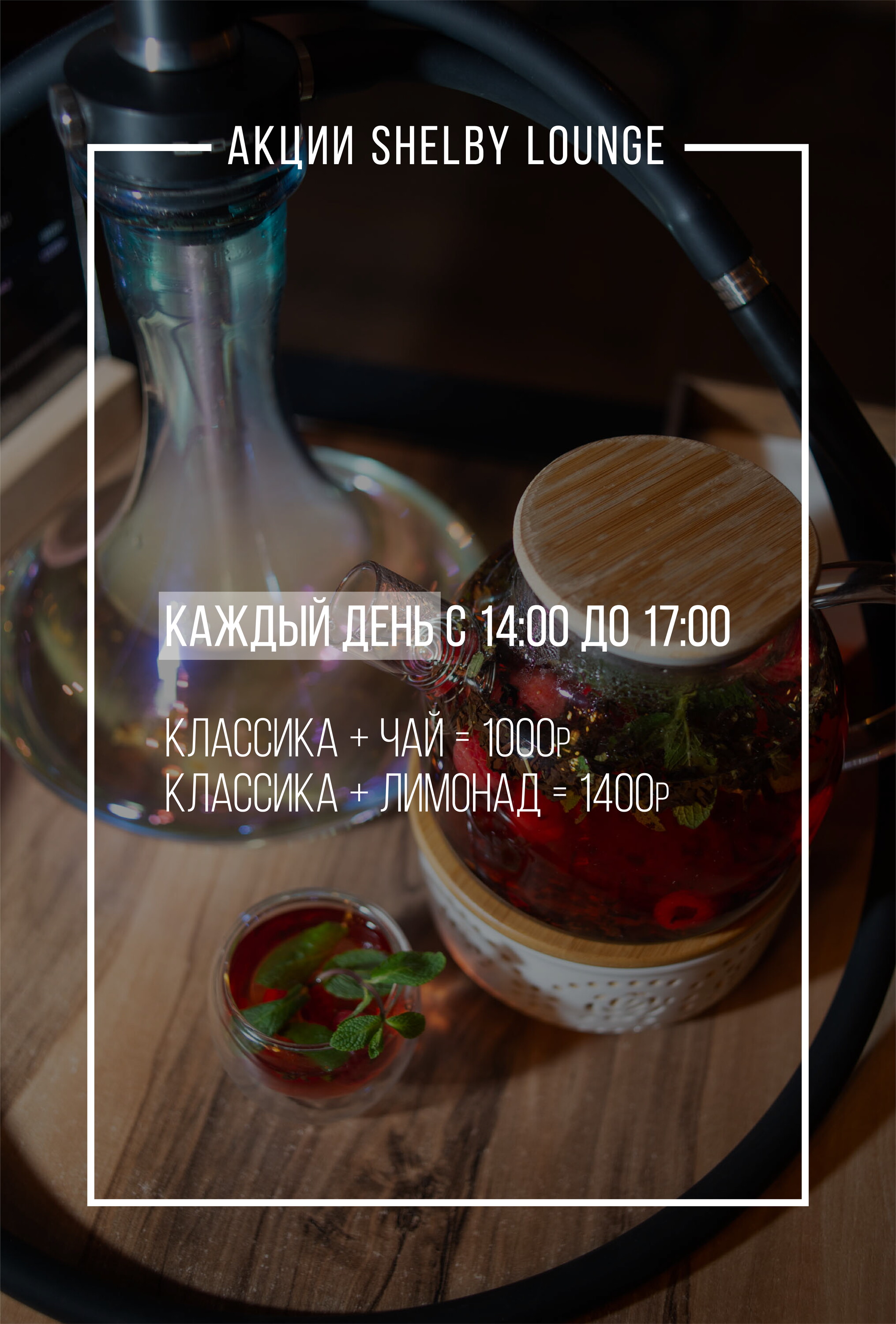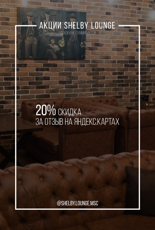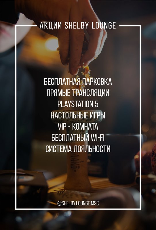 Хотите ненадолго отстраниться от рутинных мыслей и, наоборот: нужно пообщаться с коллегами, но в неформальной обстановке? Независимо от причины загляните к нам, в кальянную Шелби Лаунж! Клубящийся дым и любимые ароматы - это прекрасное место, чтобы посидеть с кальянной трубкой. Для наших клиентов - широкий выбор табака в кальянной карте и эксперименты от наших hookah-мастеров.